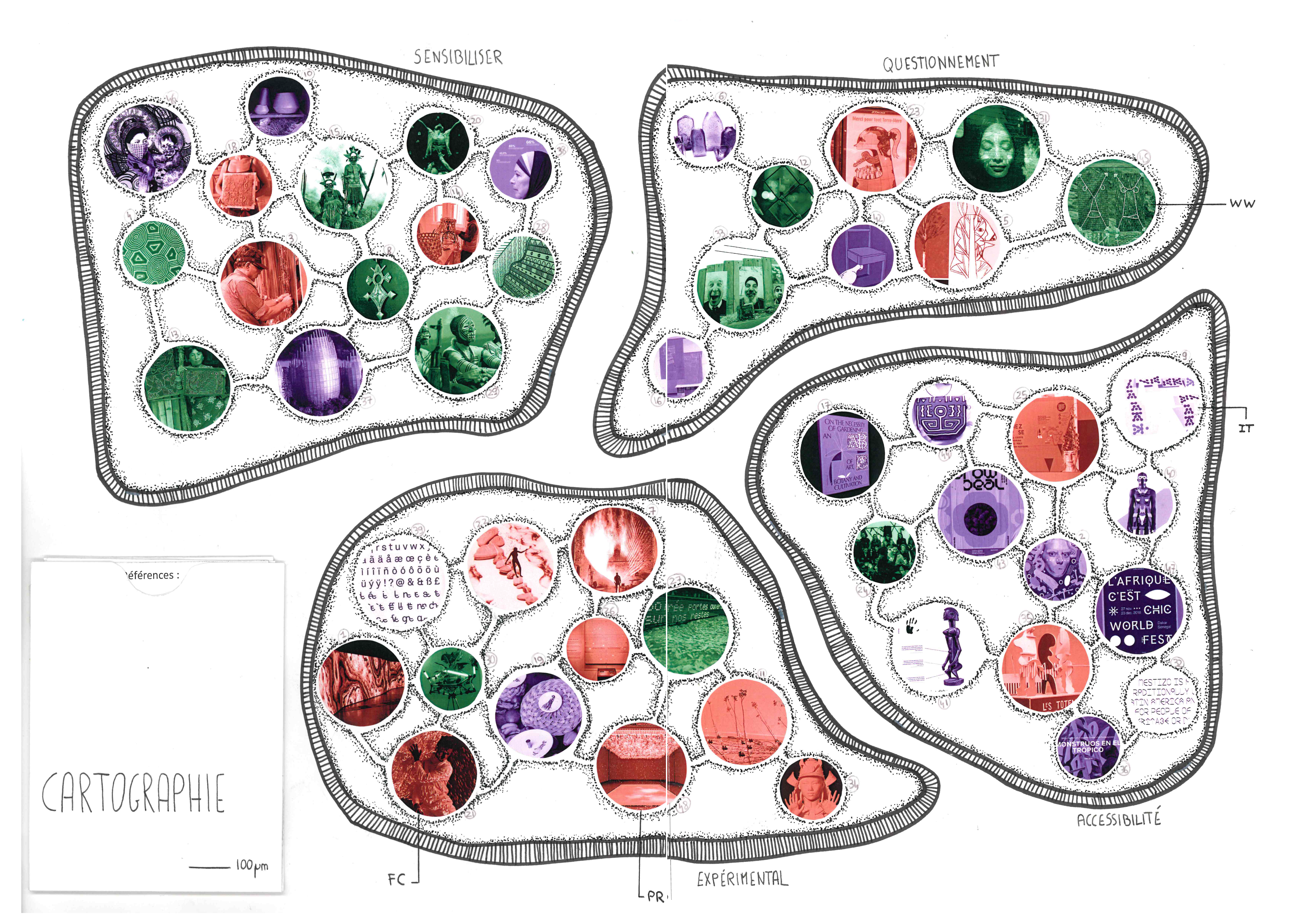 Ce travail de recherche en culture design s’interroge sur l’usage qui peut être fait de la cartographie en vue de faire émerger des références pour le mémoire. Au-delà de son aspect territorial, la cartographie conduit à la possibilité graphique de représenter une pensée en mouvement. La cartographie avait pour objectif d’établir un territoire de références artistiques afin d’agrémenter le mémoire de recherche de Dnmade 3. Elle traduit un mouvement réflexif, une trajectoire de recherche. Elle est le témoin de la navigation de la pensée.