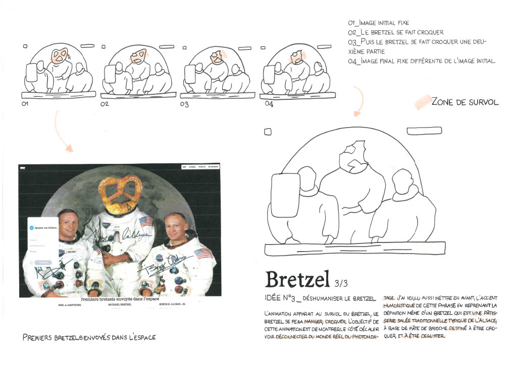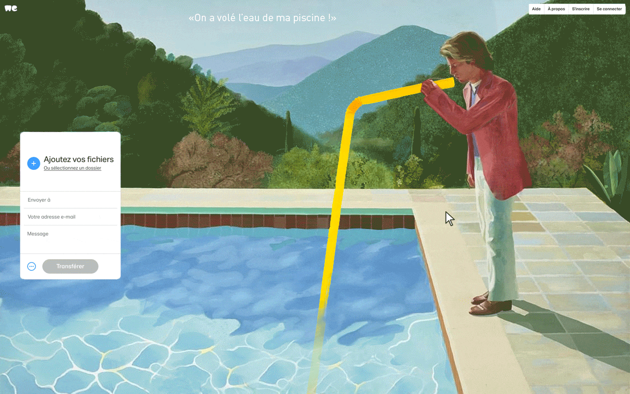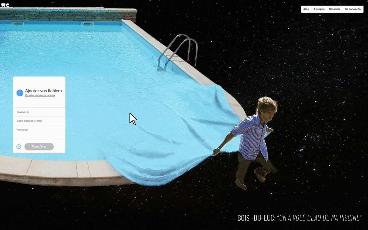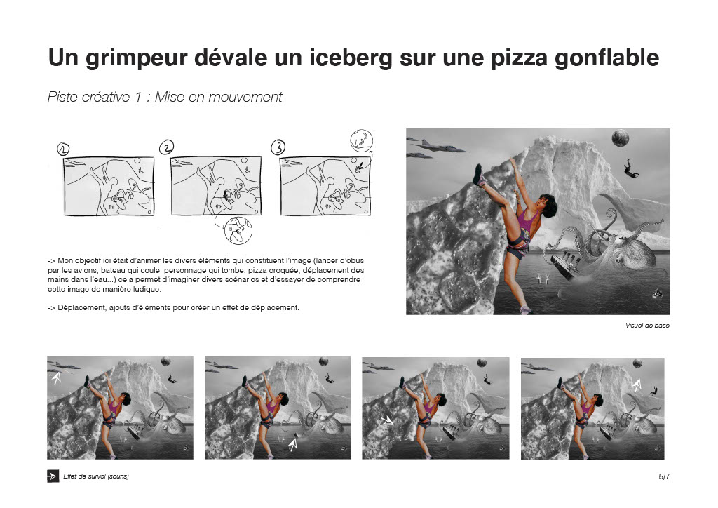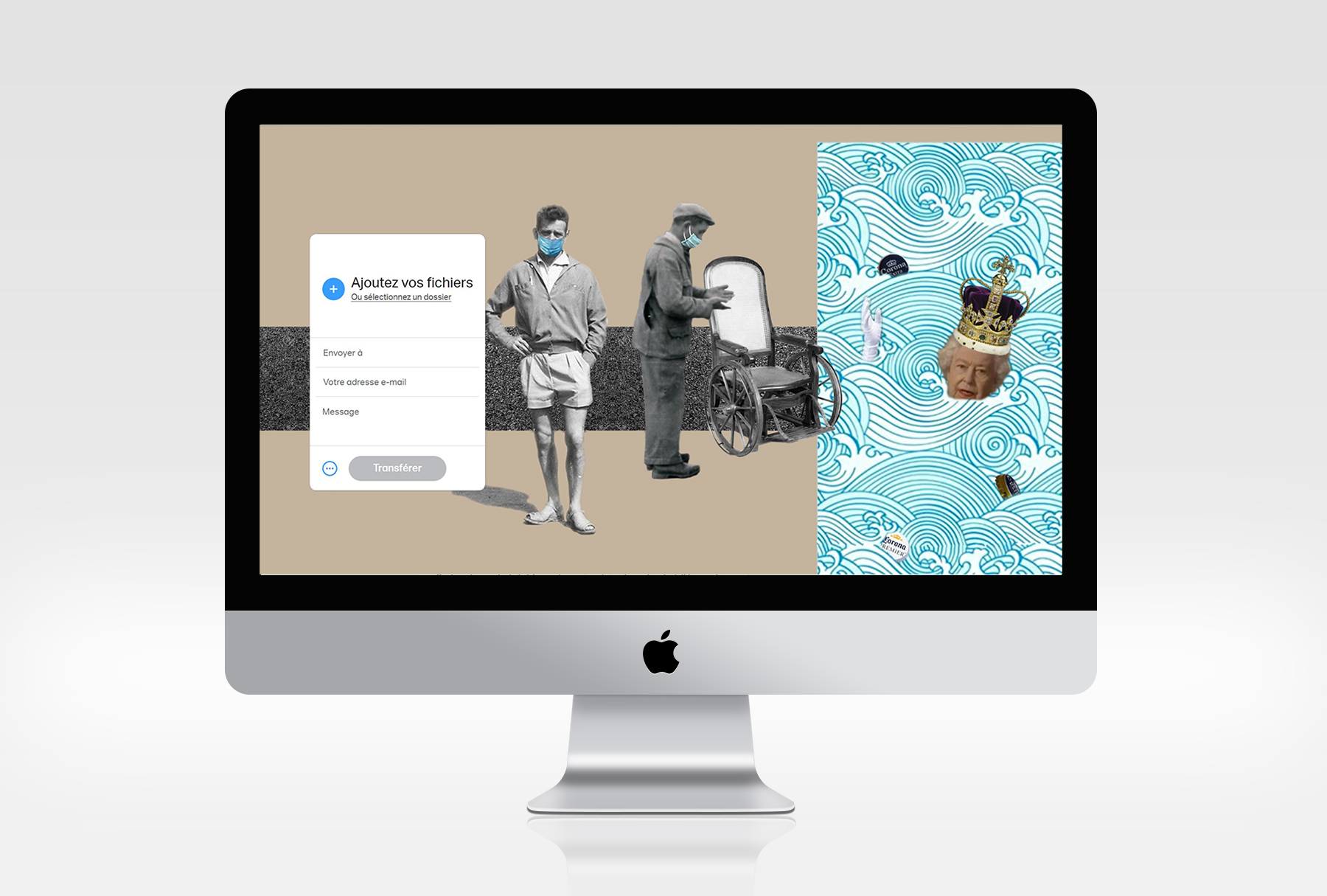 Il était demandé aux étudiants de concevoir pour l’outil numérique en ligne WeTransfer une série de visuels d’arrière-plan pour animer les temps d’attente de transfert de fichier. La technique du photomontage était imposée autour du thème le quotidien extraordinaire. Les arrière-plans devraient intégrer une interaction simple : le survol.