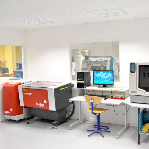 On y trouve : une découpe laser un scanner de digitalisation 3D deux déposes de fils ABS une machine à coulée sous vide avec four un laboratoire de peinture avec mélangeuse un atelier de FAO avec 4 fraiseuses à commande numérique. un atelier de modelage et usinage traditionnels 8 postes informatiques en libre service une salle informatique sur mezzanine équipée à neuf de bureaux et ordinateurs.a